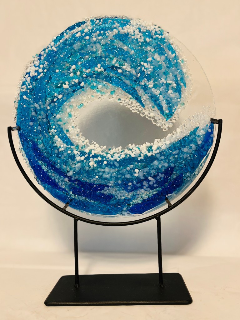 Blue Hearts Glass – Raw glass is cut into desired shapes, then heated in a kiln at temperatures from 1100-1700 degrees. Vessels are shaped using heat, gravity, sawing, grinding, sandblasting and polishing.