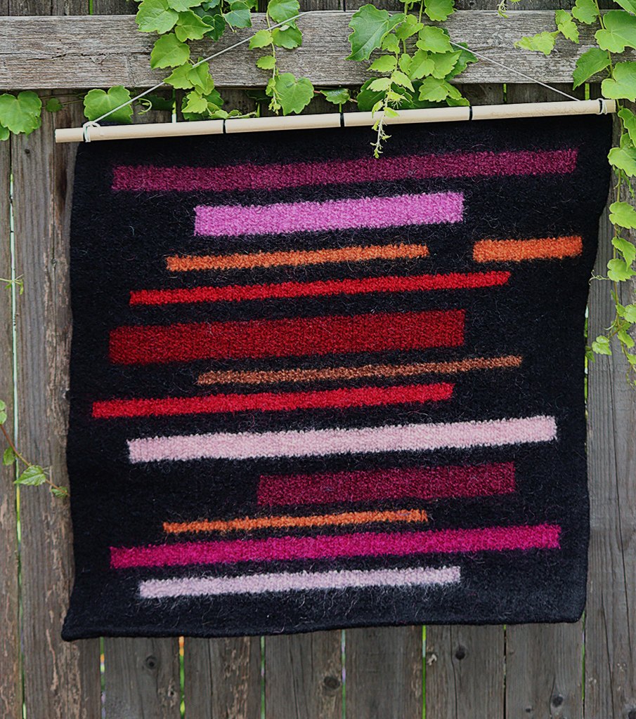 Black Sheep Knits – Knit patterned pillow covers with original designs. The covers close with a mix of vintage and modern buttons. Large abstract geometric knit wall hangings in wool, which is then felted. Colorful cowls that button in front, using cotton chenille.