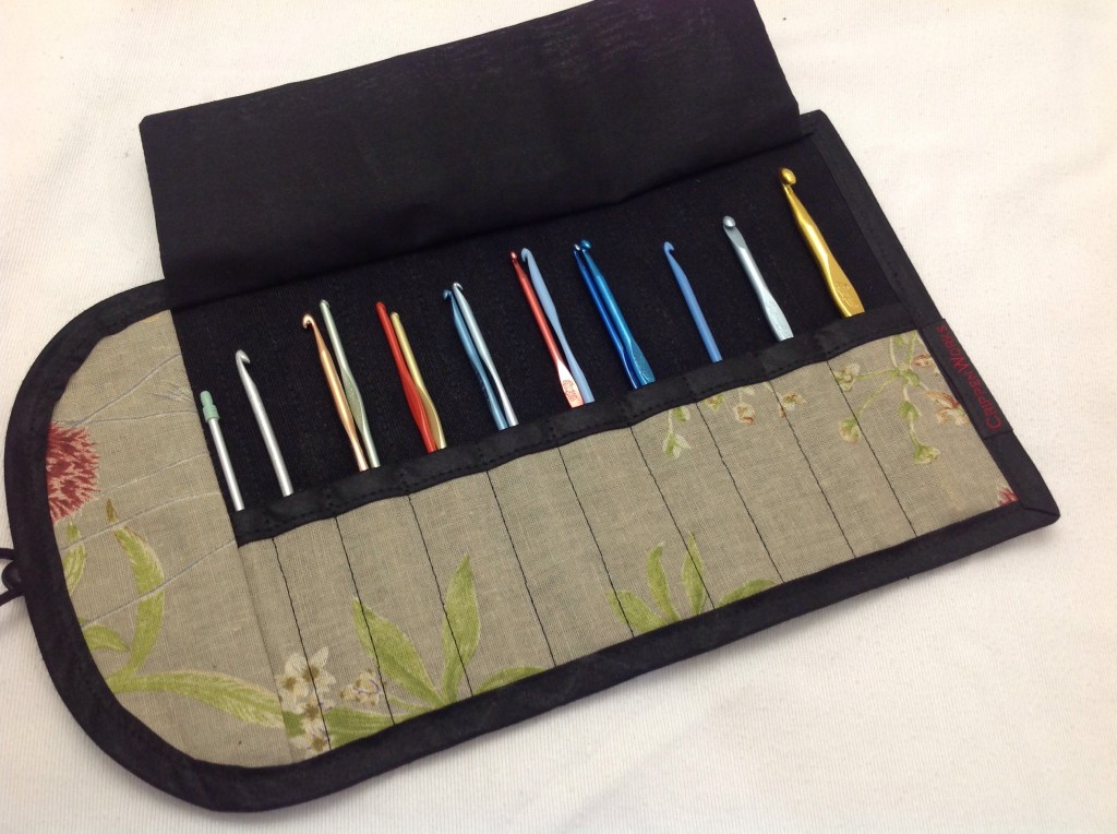 Crippen Works – Needle Cases for knitting needles and crochet hooks, created from fabric remnants and vintage buttons. Handwoven Goods colorful scarves, blankets and hand towels.